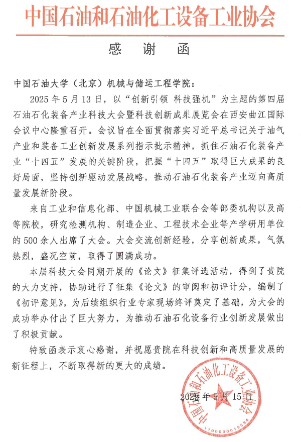 近日,中國石油和石油化工設(shè)備工業(yè)協(xié)會向我院發(fā)來專項(xiàng)感謝函,高度肯定我院在2025第四屆石油石化裝備產(chǎn)業(yè)科技大會暨科技創(chuàng)新成果展覽會籌辦中做出的積極貢獻(xiàn)。作為本次大會核心學(xué)術(shù)支撐單位,我院承擔(dān)了大會征集的學(xué)術(shù)論文的審閱和初評計分工作,以專業(yè)水準(zhǔn)贏得了高度贊譽(yù)。