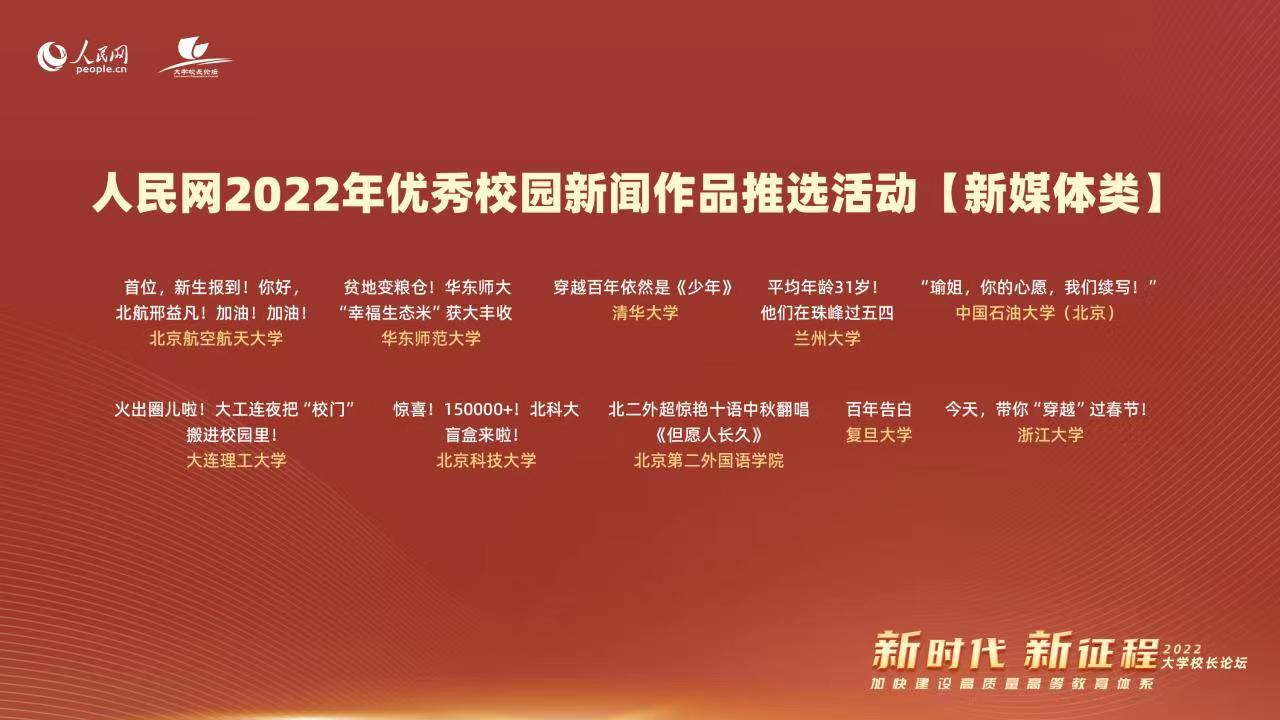 論壇上發布了《2022年高校思政課改革創新情況分析報告》,公布了“人民網2022年高校優秀校園新聞作品”名單。中國石油大學(北京)《“風華傳薪”多元立體網絡“大思政課”平臺》入選高校思政課改革創新典型案例,《“瑜姐,你的心愿,我們續寫!”》入選優秀校園新聞作品(新媒體類)。