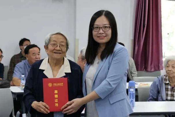 感恩儀式后,嚴大凡教授即席發表感言并向學校捐贈了她精心收藏的上百件珍貴歷史資料;翁維瓏校友向學校捐贈了翁心源先生于1944年編寫的國內第一本輸油管教材的硫酸紙印刷底稿及其他珍貴史料。學校檔案館館長海鳳代表學校向翁維瓏校友和嚴大凡教授頒發了捐贈證書。捐贈儀式上還展示了錢建華、陳永莊等校友代表敬贈的“祝母校油氣儲運越辦越好”的字幅。