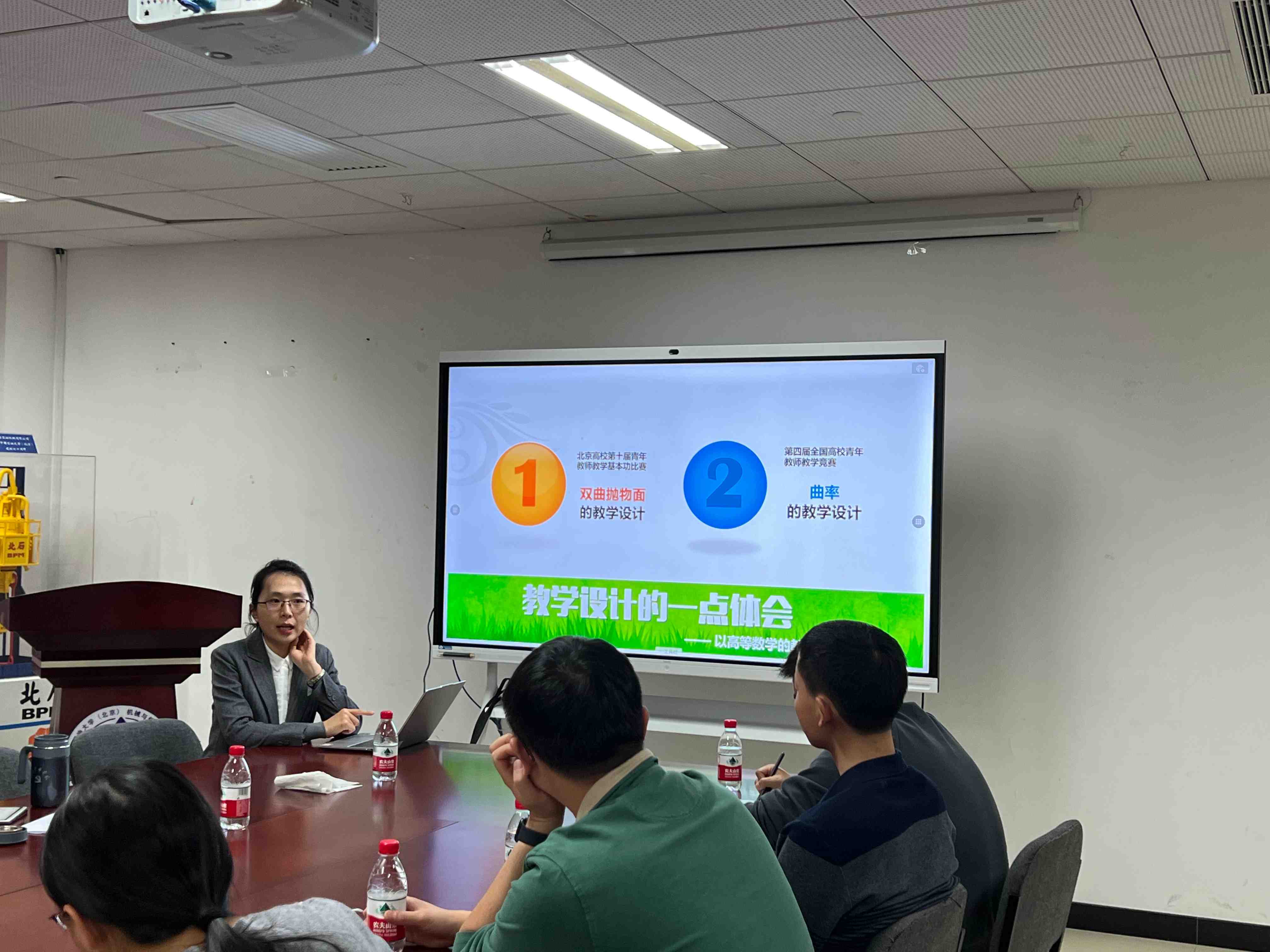 儲繼迅圍繞“教學設計的一點體會”,以“高等數學的教學設計”為例,用自己在北京高校第十屆青年教學基本功比賽和第四屆全國高校青年教師教學競賽的兩個實際參賽案例,從知識引入、知識構建、知識理解、知識提升四個方面向大家分享了如何有效構建教學設計。儲繼迅的教學設計從學生角度出發,直觀生動、激發學生的興趣,既有宏觀布局,又有細節考慮,吸引學生自主參與到課堂知識的學習和進一步思考提升當中,為在場的青年教師提供了寶貴的學習經驗。最后,儲繼迅回答了青年教師們在教學過程中遇到的疑惑,并結合當下智能科技時代背景,與大家一起探討了AI賦能教學資源的建設問題。