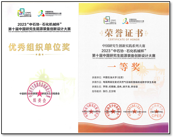 9月15日至17日,中國研究生創(chuàng)新實(shí)踐系列大賽“中石協(xié)·石化機(jī)械杯”第十屆中國研究生能源裝備創(chuàng)新設(shè)計大賽全國總決賽在中國石油大學(xué)(華東)舉行,中國石油大學(xué)(北京)共有22支隊伍參加本屆比賽,3支參賽隊伍入圍決賽。其中,由機(jī)電系張行、王文明指導(dǎo),李想(隊長)、紀(jì)振巍、凌冉、胡子濤、李非菲等同學(xué)合作完成的企業(yè)命題賽道作品《電驅(qū)兩級往復(fù)式天然氣壓縮機(jī)整橇機(jī)組數(shù)字孿生系統(tǒng)》榮獲一等獎,張行老師獲評“優(yōu)秀指導(dǎo)教師”,這是我校首次在該項賽事中斬獲全國一等獎,并入圍“能源裝備創(chuàng)新實(shí)踐之星”的榮譽(yù)角逐。此外,由于我校師生在比賽中的優(yōu)異表現(xiàn),中國石油大學(xué)(北京)獲評“優(yōu)秀組織單位”榮譽(yù)稱號。