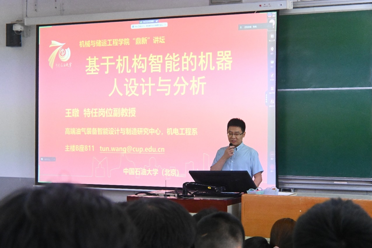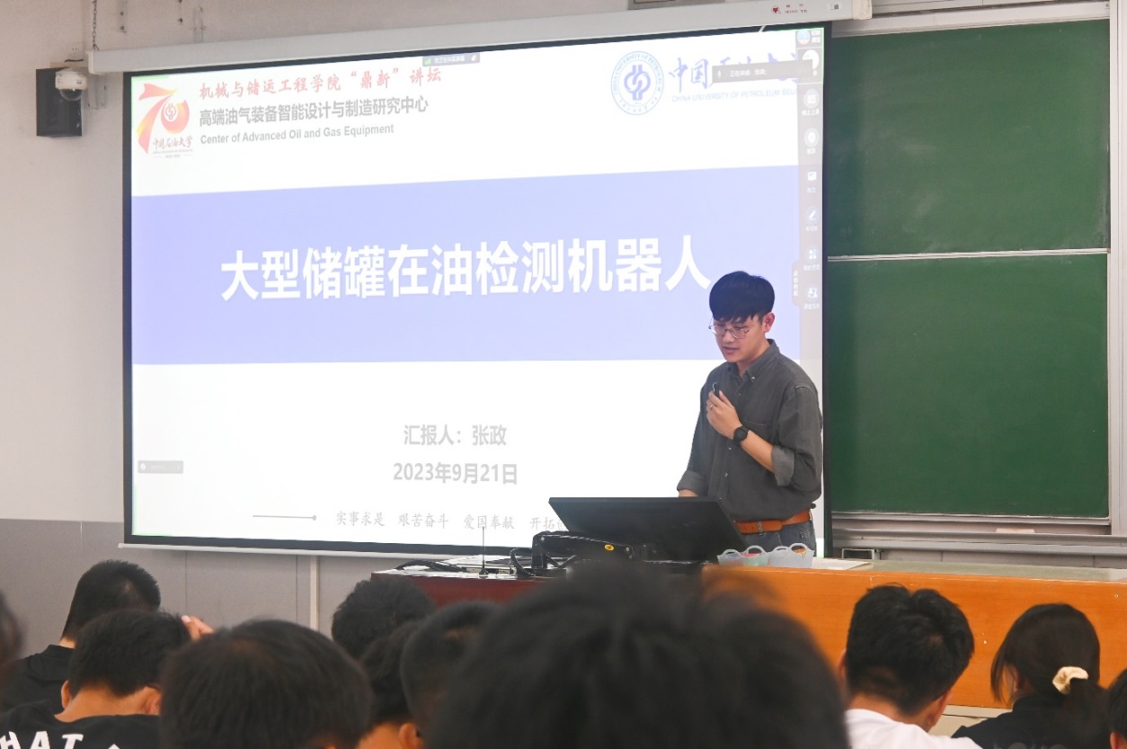 會上,賈曉麗教授首先對論壇進行了介紹,希望大家能夠通過本次論壇,加深對專業的理解。隨后丁建中副教授做了題為“航天夢想,石油助力”的精彩報告,報告中,丁建中老師詳細介紹了在我國航天器設計中的機構學研究成果。隨后,王暾、張政、朱霄霄,依次進行了各自研究領域的學術報告,主題分別為“基于機構智能的機器人設計與分析”,“大型儲罐在油檢測機器人”和“油氣管道智能封堵機器人”。學院機械設計制造及其自動化和機器人工程專業大一到大四的本科生約300余人認真聆聽了所有報告,并就相關感興趣的問題,與各位老師進行了深入的交流。