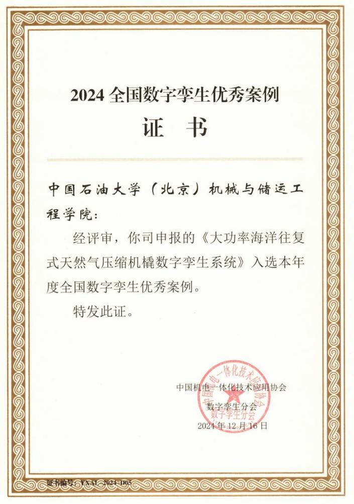 近日,中國石油大學(北京)機械與儲運工程學院張行教授、王文明副教授負責的大功率海洋往復式天然氣壓縮機撬數字孿生系統成功入選中國機電一體化技術應用協會2024年度全國數字孿生優秀案例。本次優秀案例評選活動由中國機電一體化技術應用協會數字孿生分會主辦,旨在表彰在數字化經濟領域具有突出貢獻和創新價值的實踐案例。活動吸引了來自全國數個案例參評,涵蓋工業制造、建筑與城市規劃、能源與環境、農業與食品生產等多個領域,競爭異常激烈。本年度僅14項入選,優秀案例具有較高的含金量和行業認可度,為其他企業和機構在數字孿生技術的應用和實踐方面提供了可借鑒的范例和經驗。