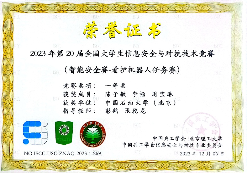 近日,第20屆全國大學生信息安全與對抗技術競賽(ISCC2023)“智能安全賽”在北京理工大學落下帷幕。我校機器人雙創實驗室師生積極組隊報名,由機械與儲運工程學院彭鶴和張乾龍兩位老師指導,本科生陳子敏、周寶琳、李暢、丁彬、袁思揚參加了該賽道的看護機器人和安全駕駛兩個賽項,克服備賽時間短、缺少調試場地等重重困難,最終斬獲全國一等獎1項,全國二等獎2項。