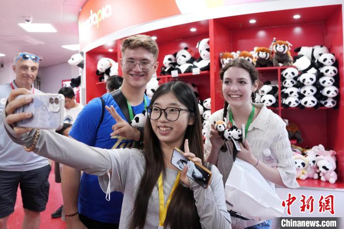 6月26日,參加中國石油大學(北京)夏令營的美國高校師生參觀北京動物園。圖為中美青年與熊貓文創自拍。張祥毅 攝