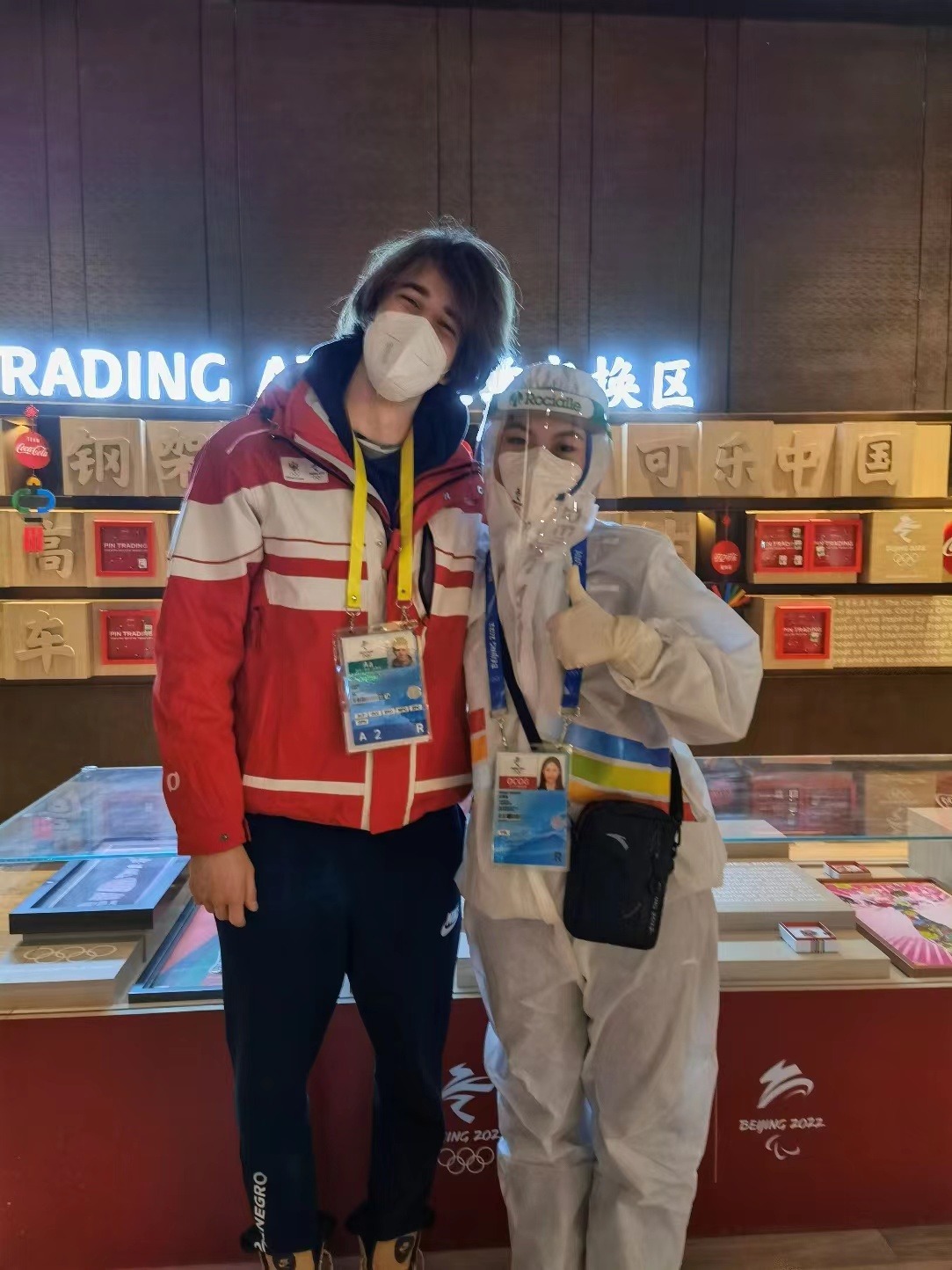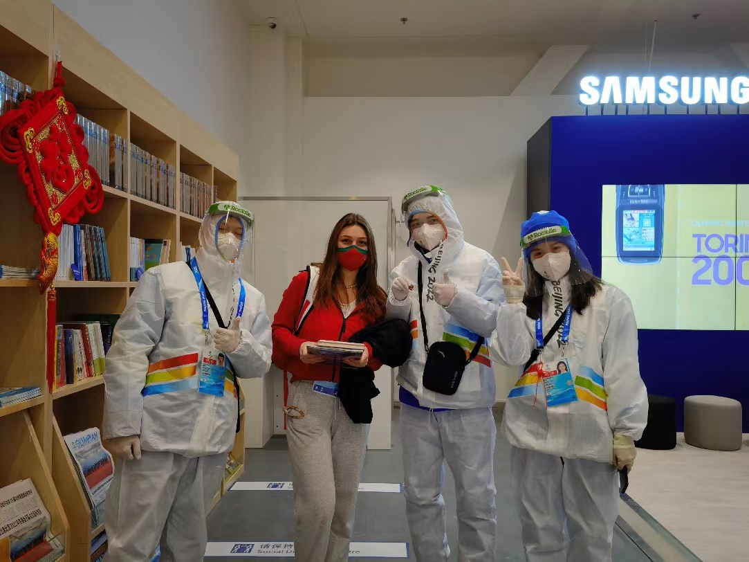 “Hello!Hi!You are welcome……”在延慶冬奧村廣場區(qū)各業(yè)態(tài)門口,冬奧村管理業(yè)務(wù)領(lǐng)域廣場區(qū)志愿者親切活潑的問候聲此起彼伏。雖然他們身穿隔離衣、頭戴面屏以及口罩,幾乎遮擋了全部面容,但志愿者們始終堅持用最美的微笑,向外國運動員傳遞團結(jié)友好的問候。