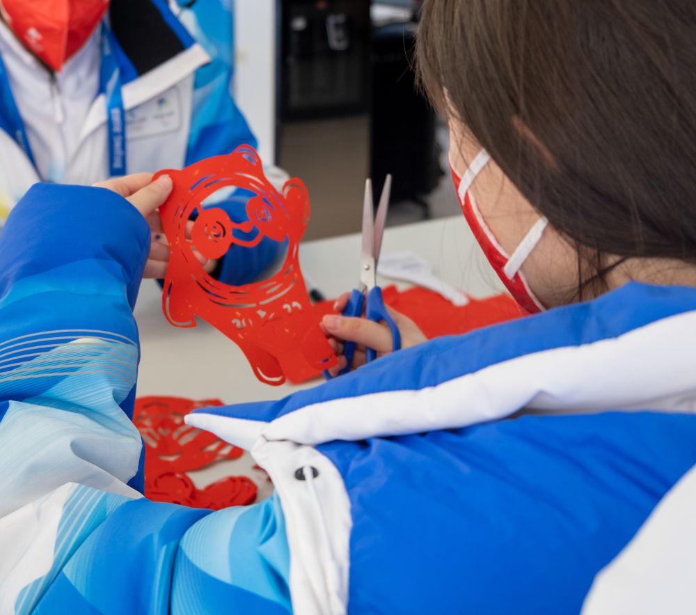 志愿者在冬奧村制作剪紙。