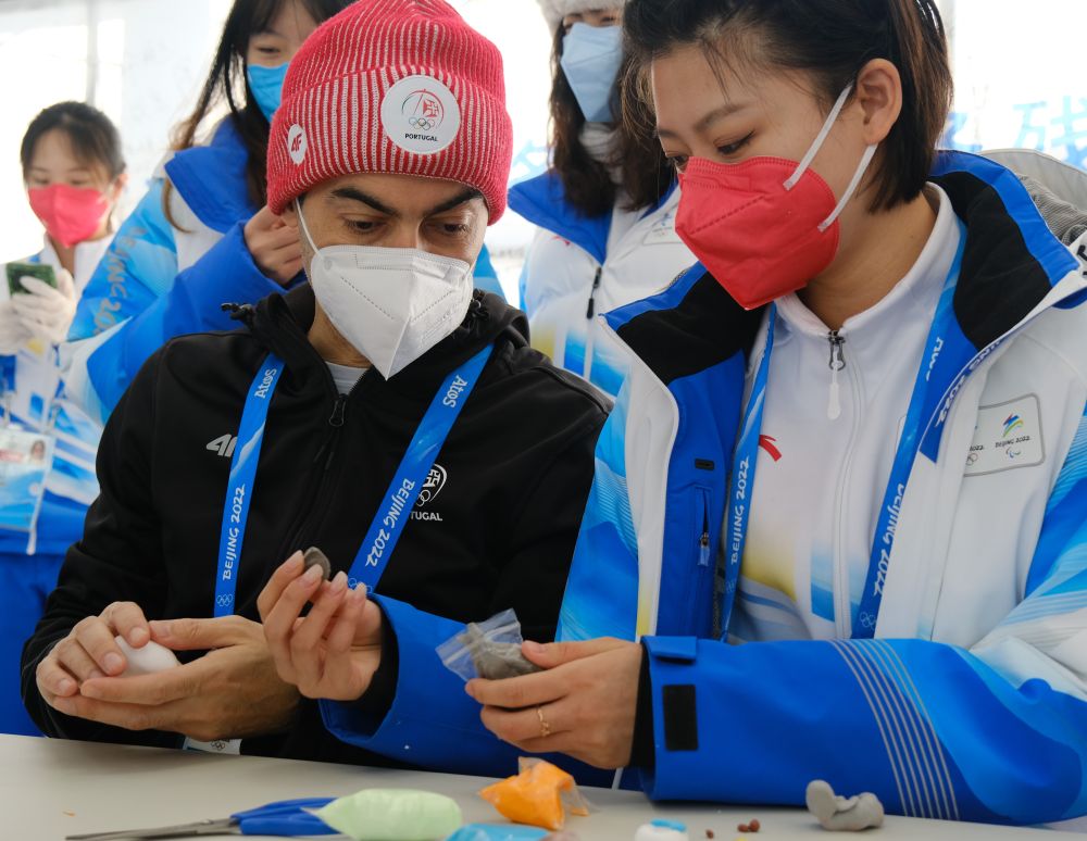 葡萄牙代表團成員向志愿者學習如何制作粘土冰墩墩。