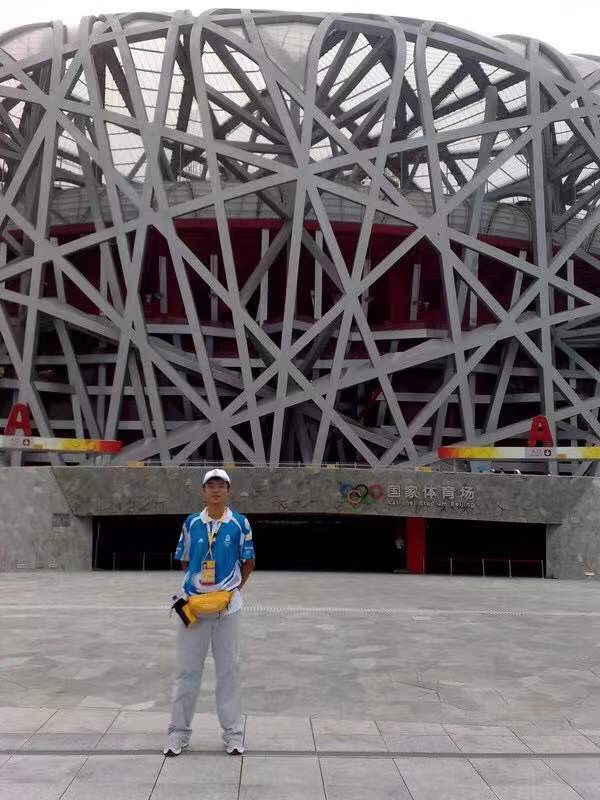 2008年,王天完成奧運(yùn)志愿服務(wù)任務(wù)后,在“鳥巢”外留影