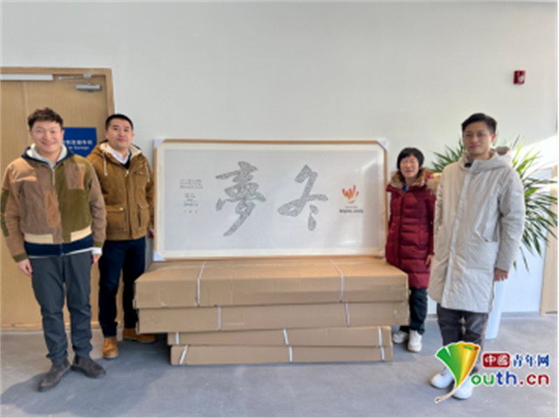 金先赤將橫版《冬夢》藝術設計作品裝裱后送至延慶冬奧村。從左至右為孫立翔、金先赤、鄧聽、夷康