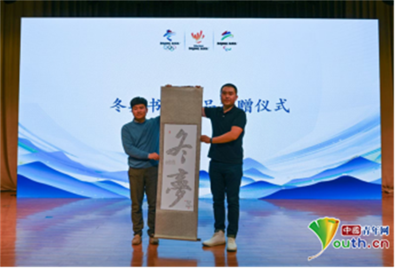 《冬夢》作品一稿多用,豎版卷軸通過PS排版成藝術設計作品,橫版的“冬夢”更適合懸掛于志愿者之家,裝裱的木質邊框與周邊景觀設計融為一體,十分和諧。豎版作品在中國石油大學(北京)2022年北京冬奧會和冬殘奧會志愿者倒計時50天誓師大會的現場,正式捐贈給了全體志愿者。