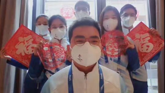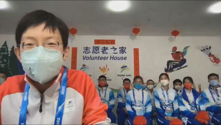 延慶冬奧村志愿者經理鄧聽介紹了冬奧村開村以來,志愿者上崗服務、疫情防控、團建激勵工作的開展情況,并現場連線在崗志愿者代表,大家紛紛通過視頻傳遞新春祝福。
