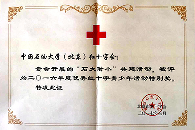 近日,由北京市紅十字會(huì)主辦的2016年度優(yōu)秀紅十字青少年活動(dòng)表彰大會(huì)舉行,石大紅十字會(huì)開展的“石大附小”共建活動(dòng)獲評(píng)2016年度優(yōu)秀紅十字青少年活動(dòng)特別獎(jiǎng)。