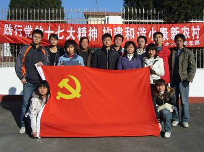 黨的十七大召開以來,全國上下掀起學(xué)習(xí)十七大精神的熱潮。在此期間,我校各個(gè)學(xué)生黨支部做出積極響應(yīng),組織開展各種形式的活動(dòng),在實(shí)踐中學(xué)習(xí)、領(lǐng)會(huì)十七大精神。化工學(xué)院、外語系、數(shù)理系、工商管理學(xué)院的部分學(xué)生黨支部,走進(jìn)順義區(qū)豹房村、龍灣屯村等結(jié)對村黨支部,緊密結(jié)合十七大精神,開展“踐行黨的十七大精神,構(gòu)建和諧小康新農(nóng)村”的紅色“1+1”主題實(shí)踐活動(dòng)。