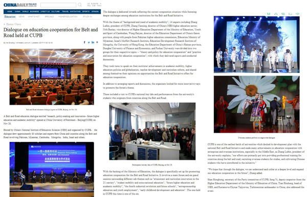 11月28日,由中國教育科學研究院主辦、中國石油大學(北京)承辦的“一帶一路教育對話:研究、決策與創新——未來高等教育與學術流動”會議在中國石油大學(北京)舉行,來自中國、巴基斯坦、緬甸、柬埔寨、蒙古等“一帶一路”沿線國家的80多位高等教育領域的專家學者圍繞“學術流動的背景與趨勢”主題,從“合作辦學的理論與政策”“合作辦學的實踐與創新”等方面展開深入研討,中國日報網(英文)對此進行了報道,新華網、人民網也關注了該項活動取得的成果。