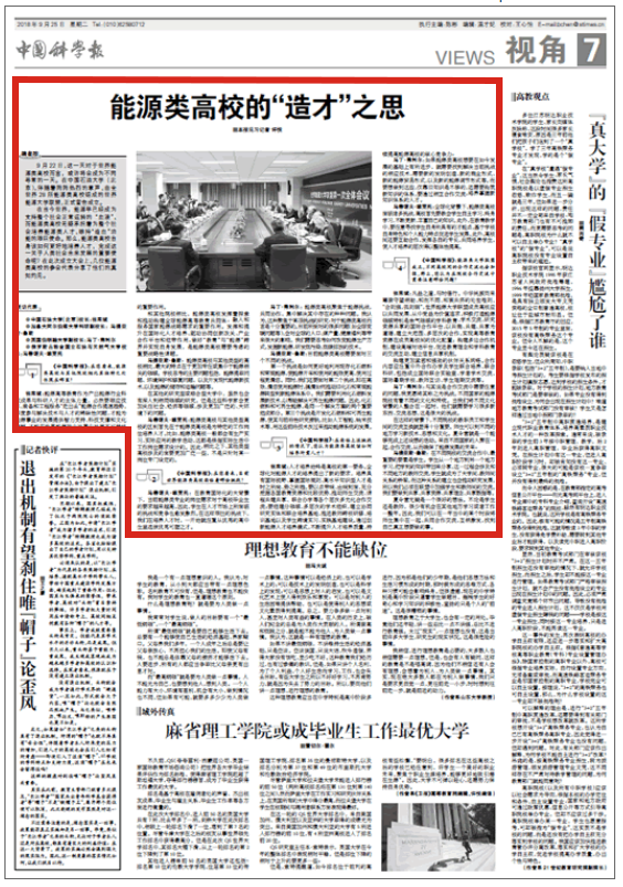 9月25日出版的中國科學報在“視角”版頭條以“能源類高校‘造才’之思”為題深度報道世界能源大學聯盟成員高校校長、副校長暢談能源類高校自身該如何更好地培養人才