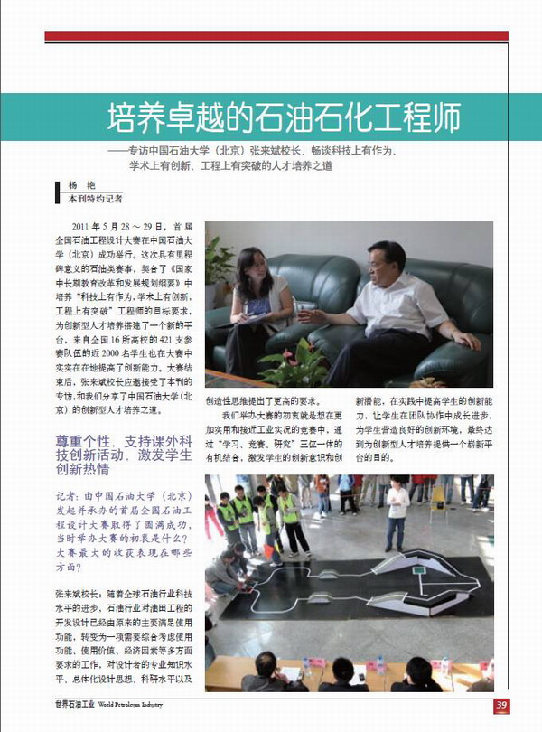 由世界石油理事會中國國家委員會、中國石油天然氣集團公司、中國石油化工集團公司、中國海洋石油總公司、中國中化集團公司、珠海振戎公司和中國石油集團經濟技術研究院共同主辦的《世界石油工業》雜志近期刊登了專訪中國石油大學校長張來斌的文章:《培養卓越的石油石化工程師——專訪中國石油大學(北京)張來斌校長暢談科技上有作為、學術上有創新、工程上有突破的人才培養之道》。