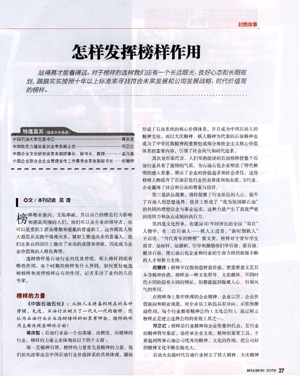 9月1日出版的《中國石油石化》雜志的封面專題“榜樣的時(shí)代”刊登文章《怎樣發(fā)揮榜樣作用》,文章采訪了中國石油大學(xué)黨委書記蔣慶哲。蔣慶哲闡述了石油行業(yè)中榜樣的力量主要體現(xiàn)在精神引領(lǐng)、形象代言、隊(duì)伍凝聚和文化傳承等方面,并回答了在國家石油行業(yè)發(fā)展的各個(gè)時(shí)期榜樣的特點(diǎn)、如何更好地選取和樹立典型并發(fā)揮榜樣的力量等問題。他在接受采訪時(shí)表示,榜樣的力量是無窮的,新的歷史時(shí)期,在實(shí)現(xiàn)中國夢偉大征程中更加需要英雄和楷模帶給行業(yè)乃至整個(gè)社會的感動和激勵。