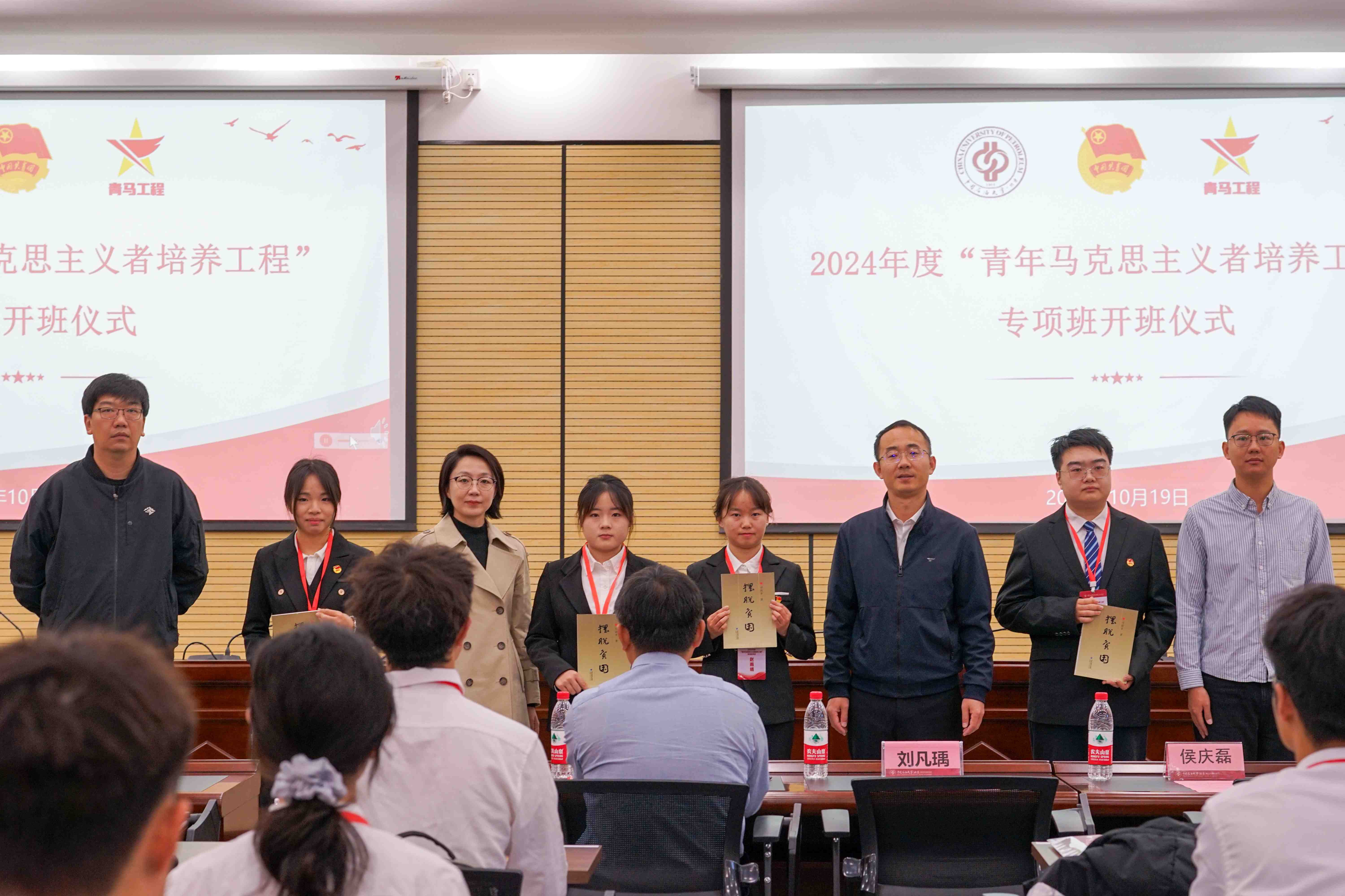 開(kāi)班儀式上,徐長(zhǎng)亮向?qū)W員代表姚俊授予象征青年馬克思主義者精神的旗幟。