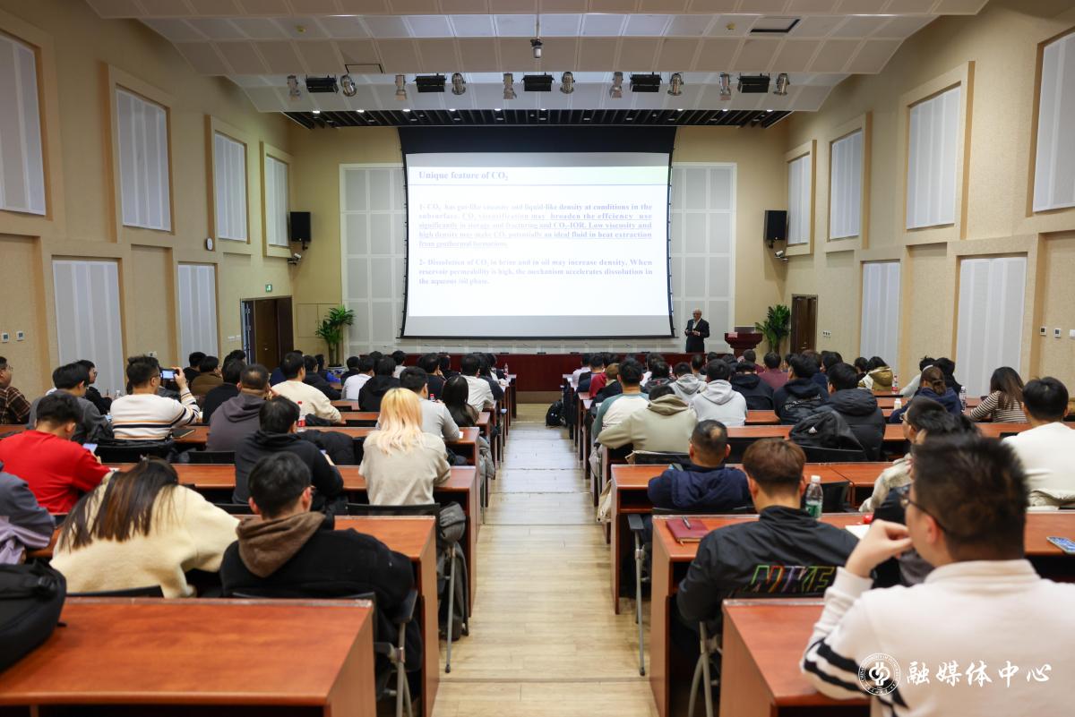 阿巴斯·費若扎巴迪院士詳細介紹了他們研究團隊在CO2咸水層封存、CO2壓裂和地熱資源開發方向的數值模擬進展。報告結束后,他與在場師生就CO2增稠試劑分子的研發與CO2壓裂耦合地熱開發的數值模擬等話題進行了深入交流。