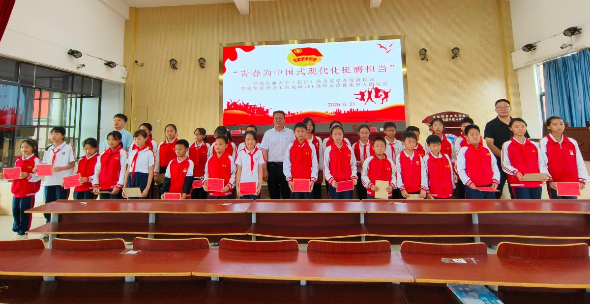 儀式上,張自強為南華縣思源實驗學校新團員佩戴團徽、頒發團員證,為30名學生發放中國石油大學(北京)勵志獎學金。他表示,中石大是能源行業領軍高校,把服務國家重大戰略需求作為最高追求,希望同學們珍惜學習機會,將個人理想融入國家發展大局。