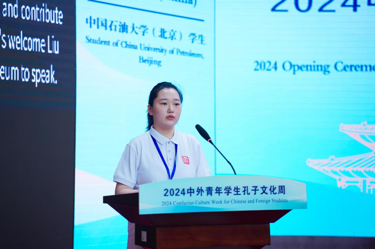 學校外國語學院英語專業2022級本科生劉昱言在活動開幕式上發言,表示將帶著對儒家文化的無限敬仰與深切向往,沿著先賢的足跡,與中外青年朋友品味傳奇佳話、品嘗美味佳肴、體驗齊風魯韻、共享發展成果,思想碰撞、學用相長,在學習中收獲友誼。