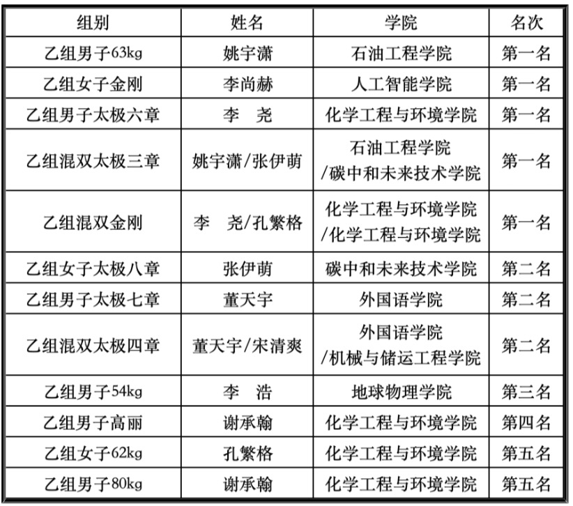 當前位置: 首頁» 時訊 中石大跆拳道隊在第20屆首都高校跆拳道錦標賽中斬獲5金3銀1銅 發布時間:2024-11-05 | 來源:體育與人文藝術學院 | 瀏覽量: 近日,首都高等學校第20屆跆拳道錦標賽在華北電力大學體育館開幕。北京大學、清華大學、中國人民大學、中國石油大學(北京)等多所高校參與比賽。中國石油大學(北京)教師吳素英帶領學校跆拳道隊參賽,經角逐,學校7人獲第一名,5人獲第二、三名。學校跆拳道隊獲男子團體總分第五名,并獲“體育道德風尚獎”。 (編輯 劉曉琳) 分享到: 排行榜 薦讀 中石大承擔的國家重點研發計劃青年科學家項目實... 《篳路昭熹》入選中國科協“科學家故事舞臺劇推... 中石大首批以實踐成果申請學位的專業學位碩士研... 連續四年!中石大在2025年“挑戰杯”首都大... 中石大與北京市第二十中學簽署戰略合作協議