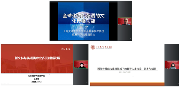 在主旨報告環節,孫有中教授和外交學院副院長孫吉勝教授等9位專家分別作了題為“理解當代中國:英語類專業的新使命”“外語專業學生的國際視野與家國情懷培養:以‘人類命運共同體’理念為例”等報告。上海交通大學人文社會科學資深教授、歐洲科學院外籍院士王寧教授在題為“全球化時代英語的文化傳播功能”的報告中指出,中國的學術研究正變得越來越國際化或全球化,如果沒有英語的中介,將無法實現。山東大學王俊菊教授在“新文科與英語類專業的多元創新發展”的報告中分享了山東大學創新實驗班的實踐案例。北京第二外國語學院副校長程維教授的報告“國際傳播能力建設視域下的翻譯人才培養:固本與創新”探討了翻譯人才培養的“本”與“新”。北京語言大學英語學院院長穆揚教授的報告“中國文化國際傳播復合型外語人才培養探索與實踐”、對外經濟貿易大學英語學院院長向明友教授的報告“新文科背景下英語專業核心競爭力漫談”、中國政法大學外國語學院院長張清教授的報告“涉外法治人才培養之法律英語專業建設”,以及中石大外國語學院院長趙秀鳳教授的報告“行業特色高校英語專業建設的守正與創新”,分別立足各學校特色,分享了各校英語專業在探索復合型人才培養、新文科背景下學科融合方面的相關經驗。