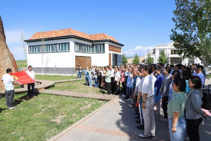 5月18日下午,實踐團第一站來到中哈邊境的小白楊哨所,開展沉浸式主題黨課。通過161團退伍老兵管述軍的介紹和實地參觀小白楊哨所展覽館,實踐團成員了解了小白楊的故事,被邊防戰士和一代代兵團人為國戍邊、不畏犧牲、奉獻青春的事跡感動。在邢曉凱的領誓下,全體黨員教師舉起右拳,重溫入黨誓詞,再憶入黨初心。