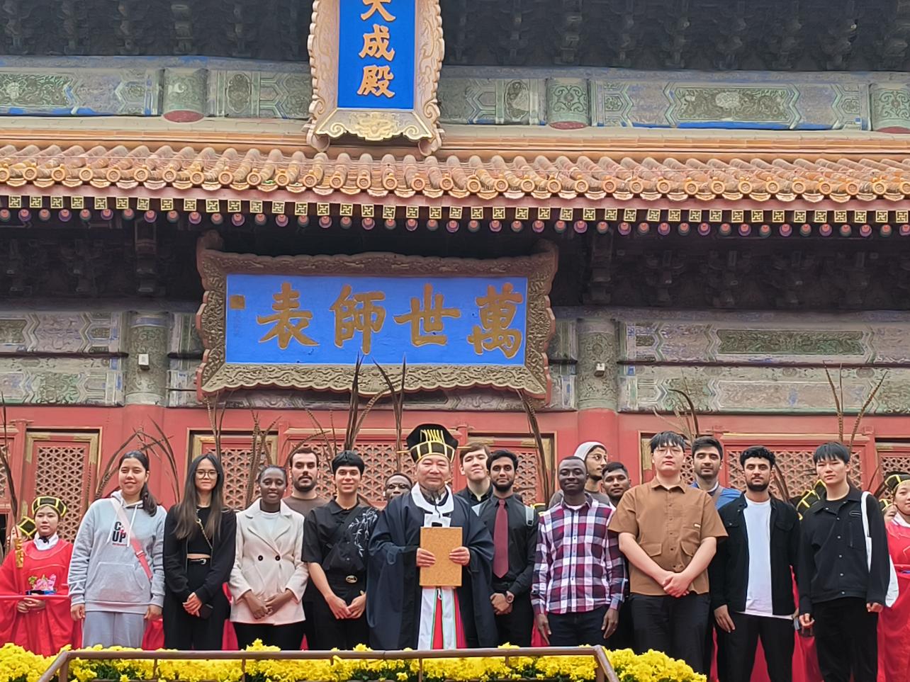 9月28日,來自土庫曼斯坦、哈薩克斯坦、孟加拉國等九個國家的來華留學(xué)生代表前往北京市孔廟和國子監(jiān)博物館參加第2575屆祭孔大典,現(xiàn)場學(xué)習(xí)了中國傳統(tǒng)四拜禮,觀賞了《禮記》詩篇的吟誦和六佾舞的表演,感受到了儒家思想和中國傳統(tǒng)建筑、禮儀、舞蹈、詩詞文化的獨特魅力。