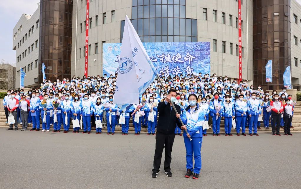 文永紅為中石大冬奧宣講團(tuán)代表、化學(xué)工程與環(huán)境學(xué)院團(tuán)委書記、中石大冬奧志愿者臨時(shí)團(tuán)總支書記韓瑾授旗。