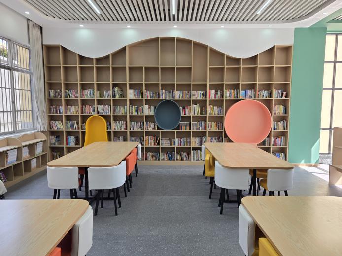 為了給孩子們創造更加舒適、溫馨的閱讀環境,從書架的高度到桌椅的擺放,圖書室的每一個設計細節都充分考慮了孩子們的使用習慣和身體發育特點。柔和的色彩搭配、寬敞的空間布局,讓整個圖書室充滿了童趣與溫暖。