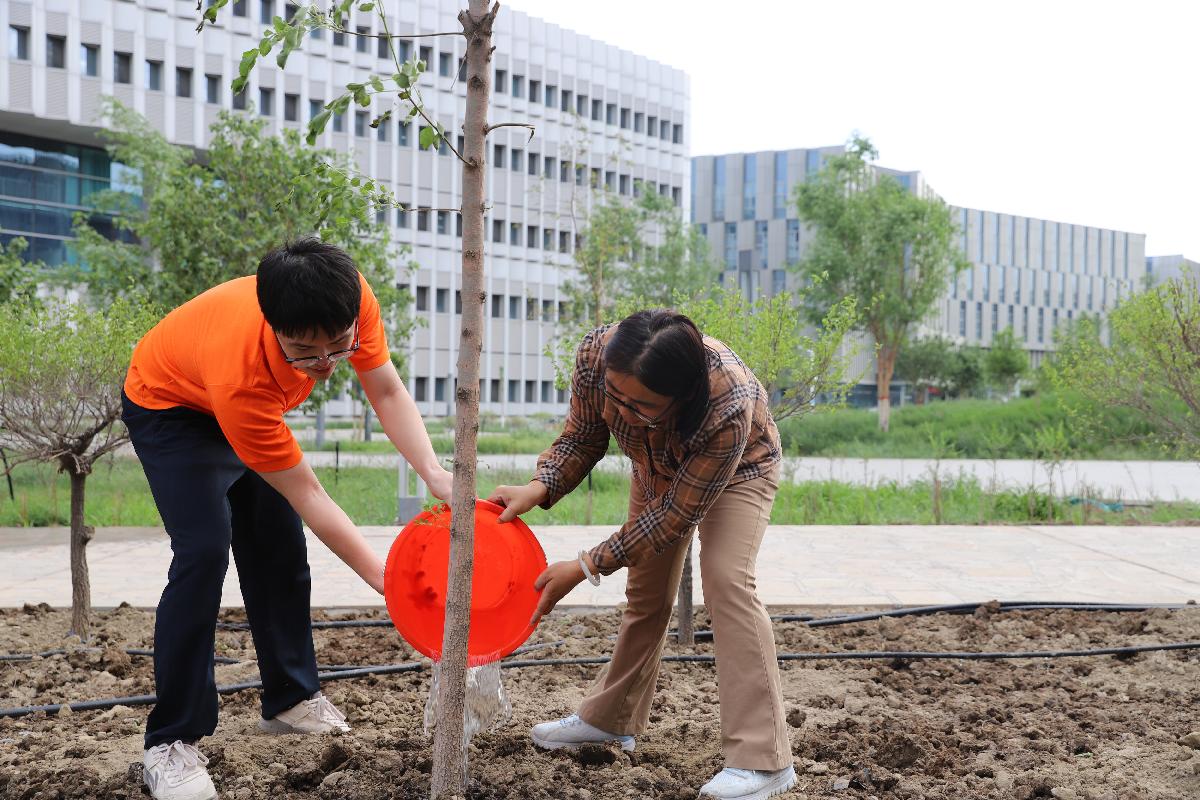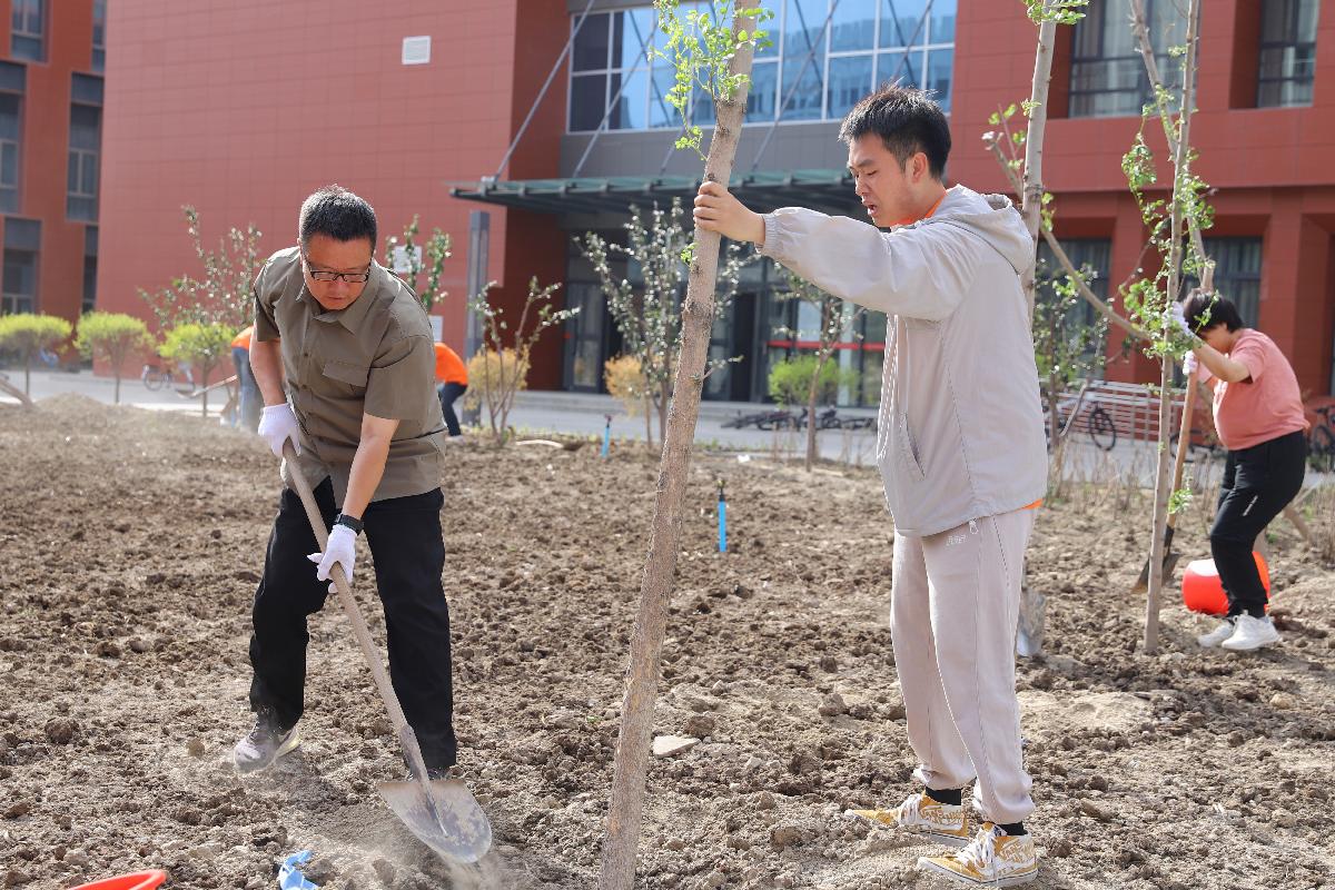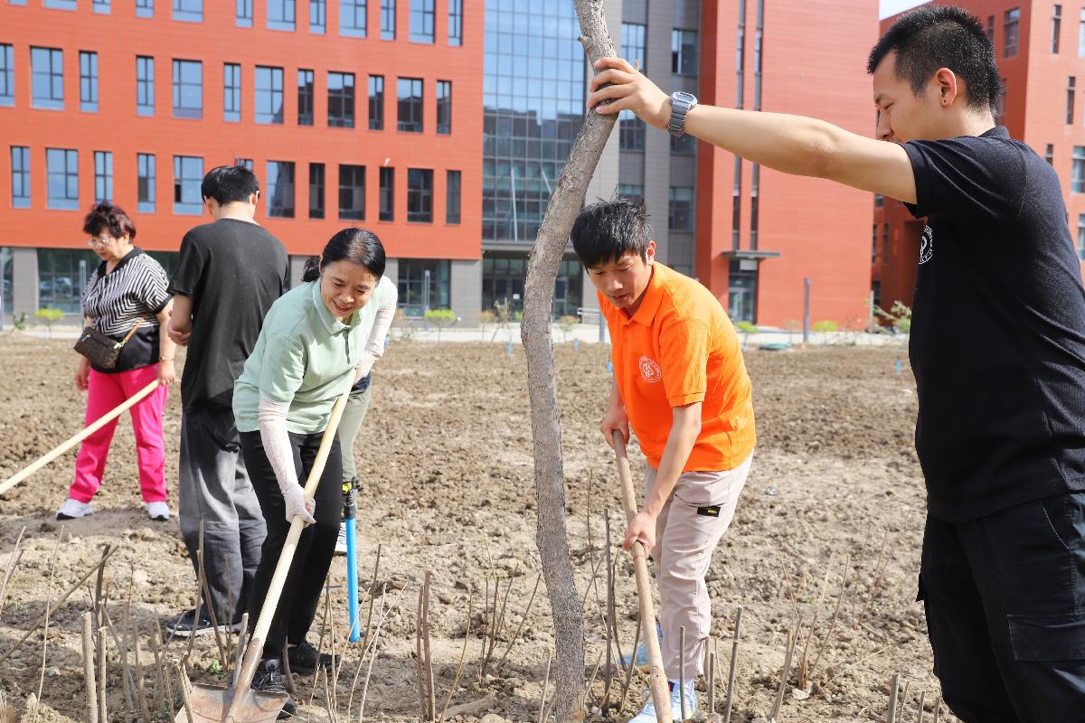 活動(dòng)伊始,在工作人員的精心引導(dǎo)下,師生們兩兩結(jié)對,彼此默契配合。有的負(fù)責(zé)穩(wěn)穩(wěn)扶住樹苗,有的則專注地培土夯實(shí);有的提起水桶,有的則小心翼翼地澆灌著每一棵樹苗。整個(gè)現(xiàn)場秩序井然,洋溢著和諧融洽的氛圍。130余棵小樹苗穩(wěn)穩(wěn)扎根在土地上,為校園增添了一抹生機(jī)勃勃的新綠。