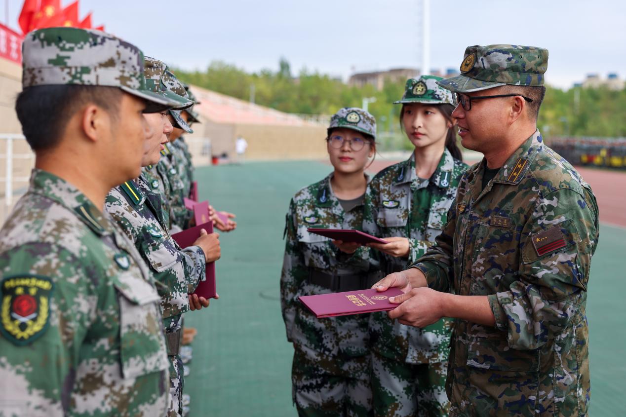 克拉瑪依校區黨委副書記徐長亮宣讀了2025級本科生軍訓團表彰決定,8個先進集體、39名軍訓教官、89名軍事訓練標兵和122名作風紀律標兵獲得嘉獎。武警某部中校參謀長徐永康為優秀承訓教官代表頒發榮譽證書,克拉瑪依校區副校長、總會計師張紅艷為參訓學生標兵代表頒發榮譽證書。