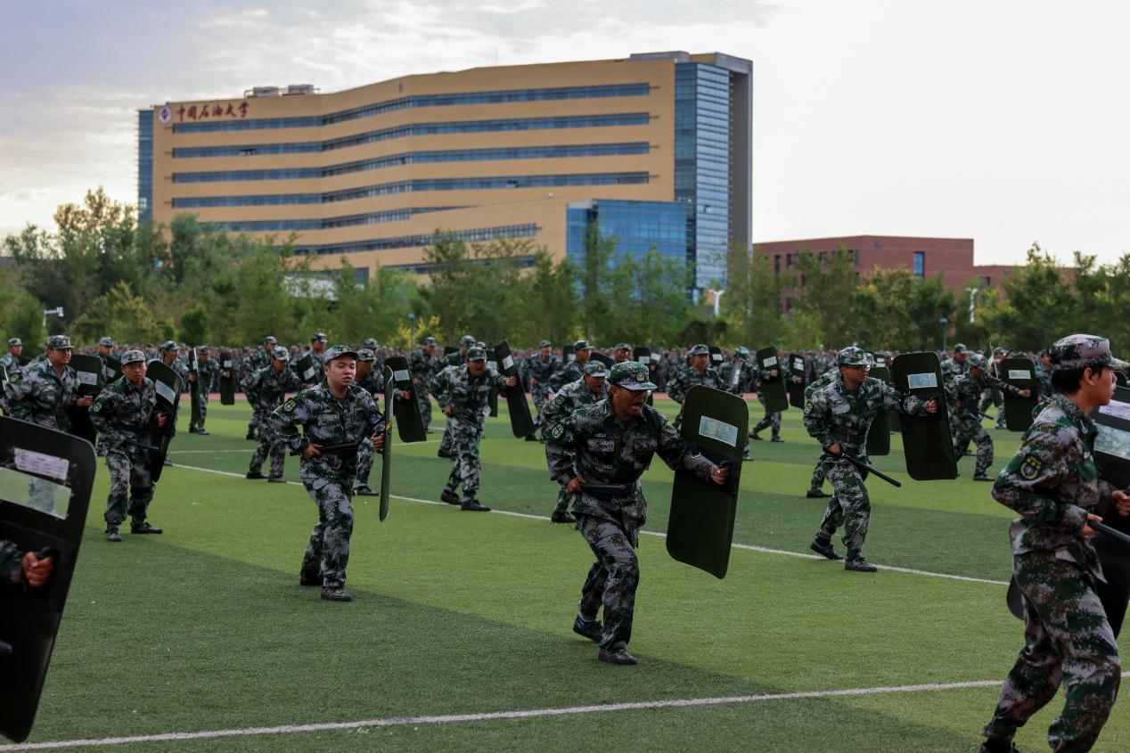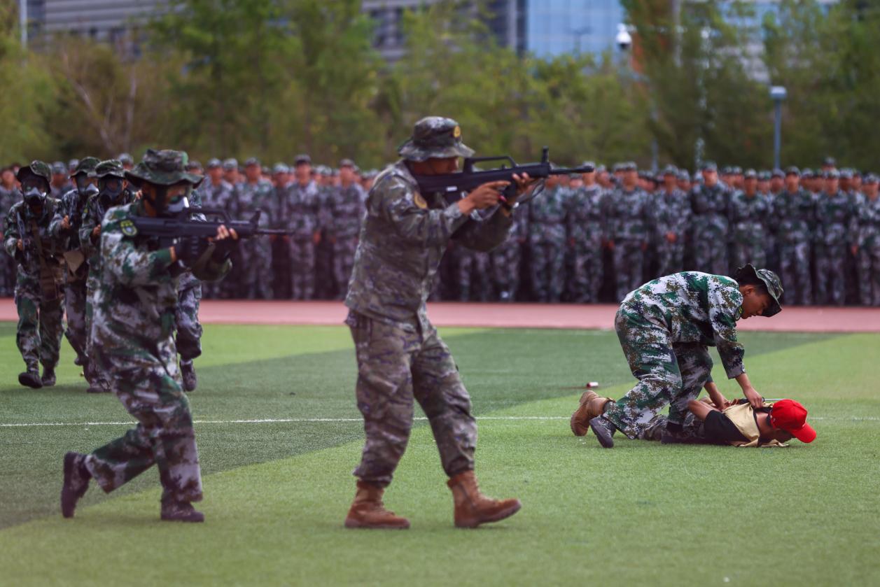 2025級新生進行了一場精彩的軍訓匯報表演。表演中,他們展示了在軍訓期間學到的各種軍事技能和戰術動作,包括擒敵拳、刺殺操、警棍盾牌術、綜合戰術演練等科目,展現出中石大青年愛國愛校、奮發有為的堅定決心。