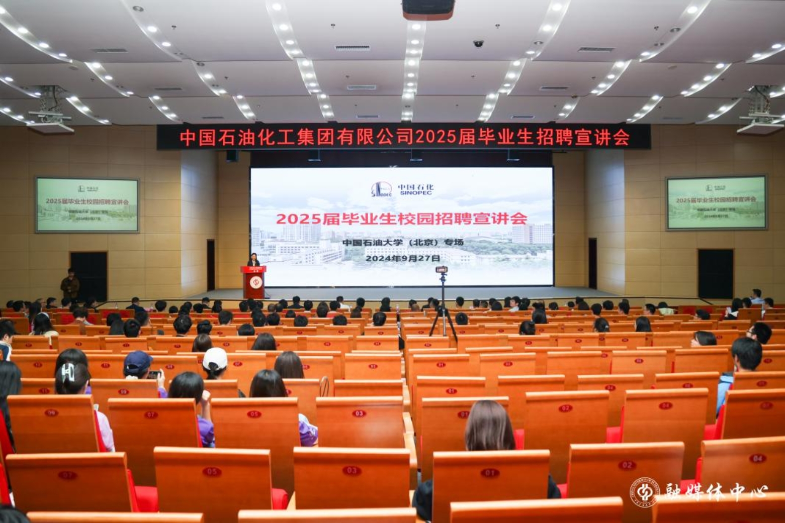 9月27日,中國石油化工集團有限公司黨組組織部(人力資源部、黨組編制辦)培訓開發室主任楊俊,中國石化工程建設有限公司副總經理董汪平,中國石化石油工程技術研究院黨委副書記、紀委書記、工會主席朱振中,帶隊來中石大舉辦2025屆畢業生校園招聘宣講會,中國石化下屬60余家企業,120余位代表到校招聘。學校黨委副書記文永紅參加宣講會并致歡迎辭。就業指導中心負責人、各學院學生工作負責人、畢業班輔導員以及400余名畢業生現場參加宣講會。宣講會線上同步直播,6000余名師生在線收看。