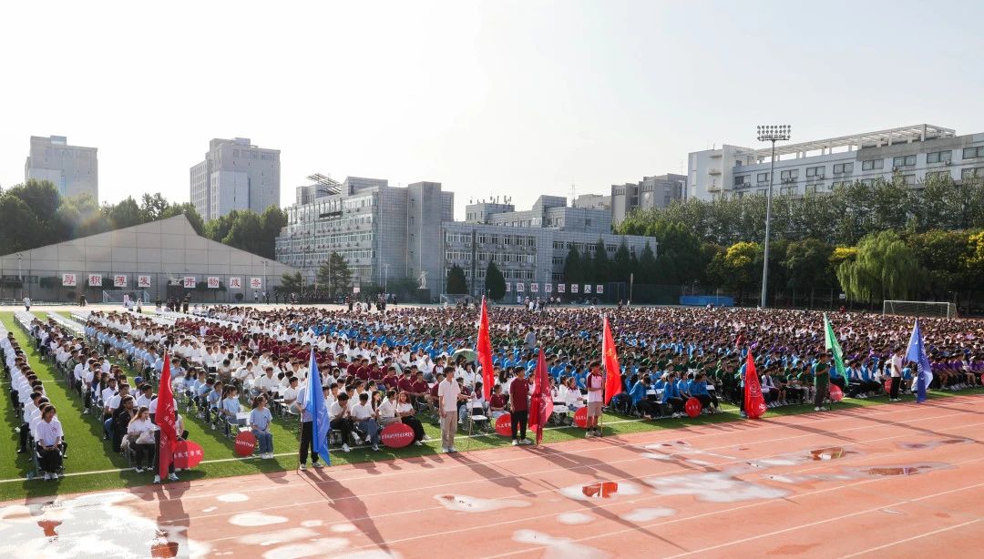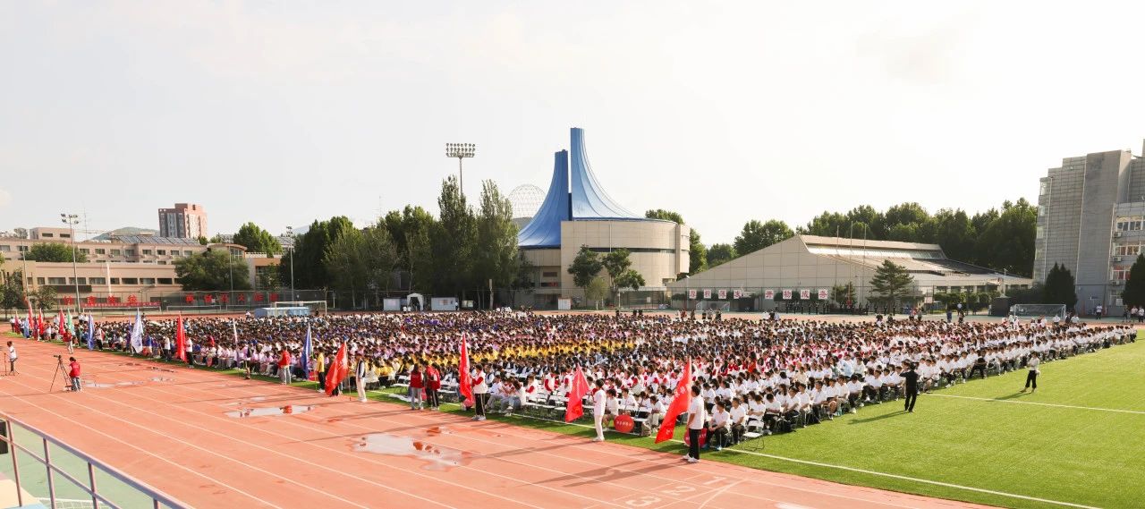 紅旗操場主席臺上,寫有校風“實事求是、艱苦奮斗”、校訓“厚積薄發、開物成務”的背景板格外醒目,主席臺兩側的大屏上播放著校園風光和新生報到的視頻。典禮現場,2023級新生容光煥發,整齊就坐,座椅擺出校徽和“70”的造型,現場氛圍濃厚熱烈。