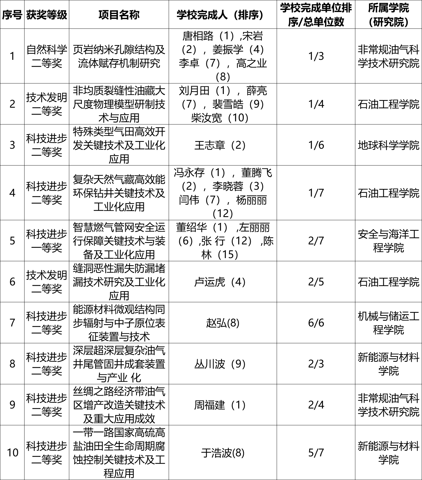 11月23日,北京市人民政府發(fā)布《關(guān)于2021年度北京市科學(xué)技術(shù)獎(jiǎng)勵(lì)的決定》,中國(guó)石油大學(xué)(北京)共10項(xiàng)科技成果獲獎(jiǎng)。其中以第一完成單位獲自然科學(xué)二等獎(jiǎng)1項(xiàng)、技術(shù)發(fā)明二等獎(jiǎng)1項(xiàng)和科技進(jìn)步二等獎(jiǎng)2項(xiàng);以非第一完成單位獲科技進(jìn)步一等獎(jiǎng)1項(xiàng)、二等獎(jiǎng)4項(xiàng),技術(shù)發(fā)明二等獎(jiǎng)1項(xiàng)。