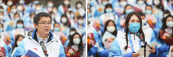 教師志愿者代表、地球物理學院團委書記王天講述了自己在志愿工作過程中感受到的自豪、溫暖和希望的故事。學生志愿者代表、外國語學院2019級本科生陳江宇表示將繼續開拓創新、銳意進取,講好中石大冬奧志愿故事。