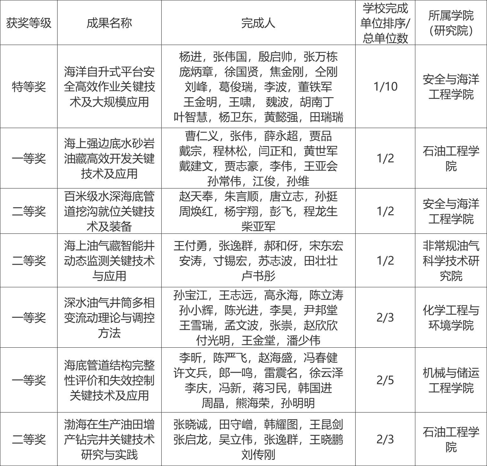 中石大7項成果獲2021年度海洋工程科學技術獎