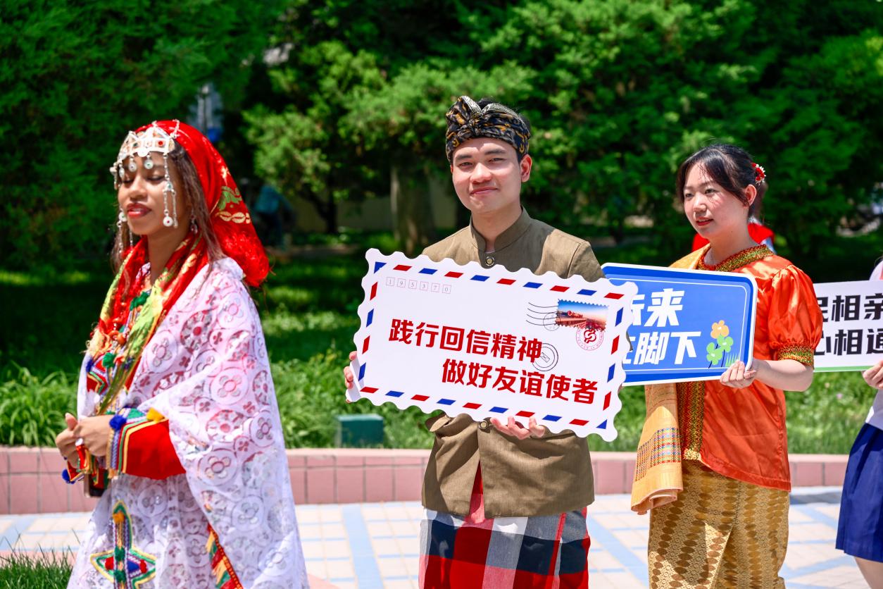 本屆文化節特別邀請60名中外青年學子,穿著各國傳統服飾,在舞臺上展示青春風采,圍繞學校噴泉廣場完成多元文化巡游。巡游過程中,青年學子高舉“踐行回信精神,做好友誼使者”“講好中國故事”“民相親,心相通”等手持牌,跟隨音樂節拍與在場觀眾熱情互動。