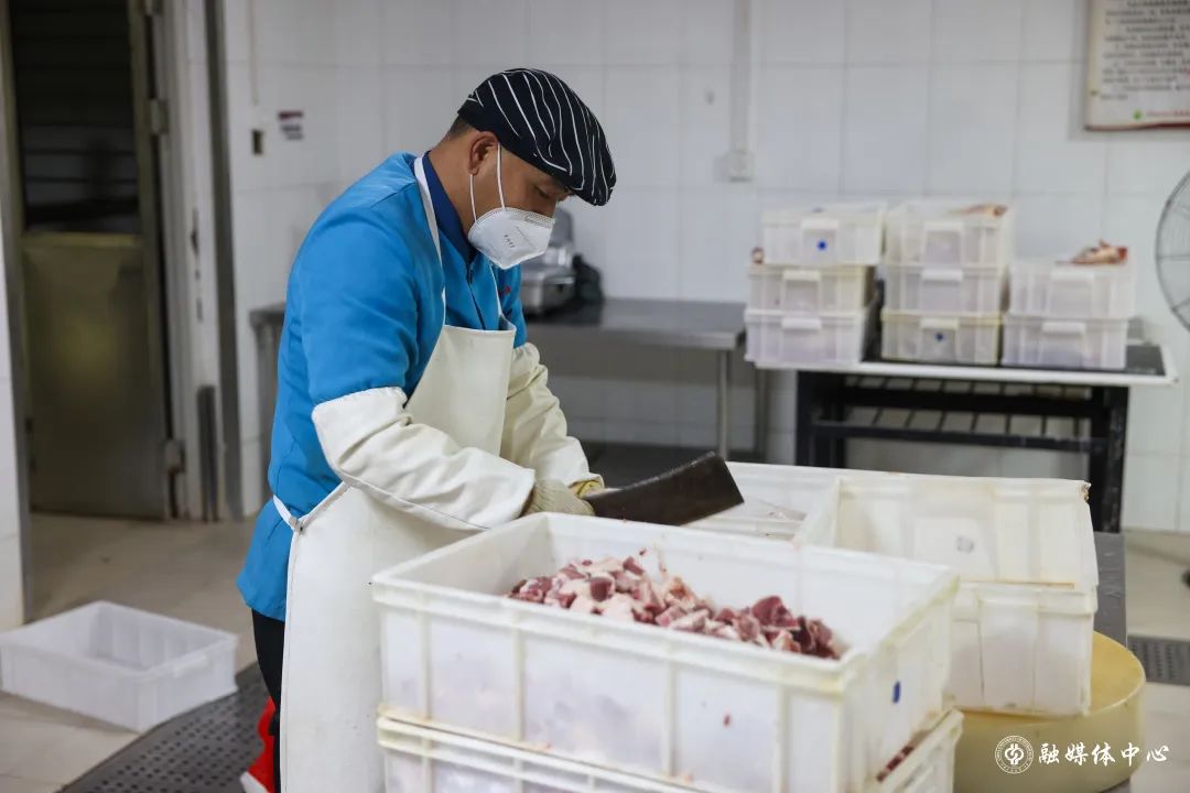 王子臣、齊宏春是第一食堂負責鮮肉加工的師傅,雞、鴨、魚、排骨、肉餡……每天早上不到5點就開始切肉,11月16日就切了70箱鴨腿、320斤肉。