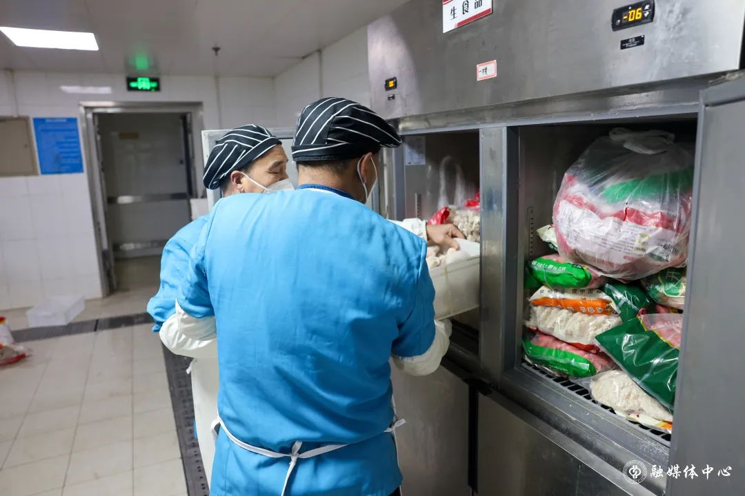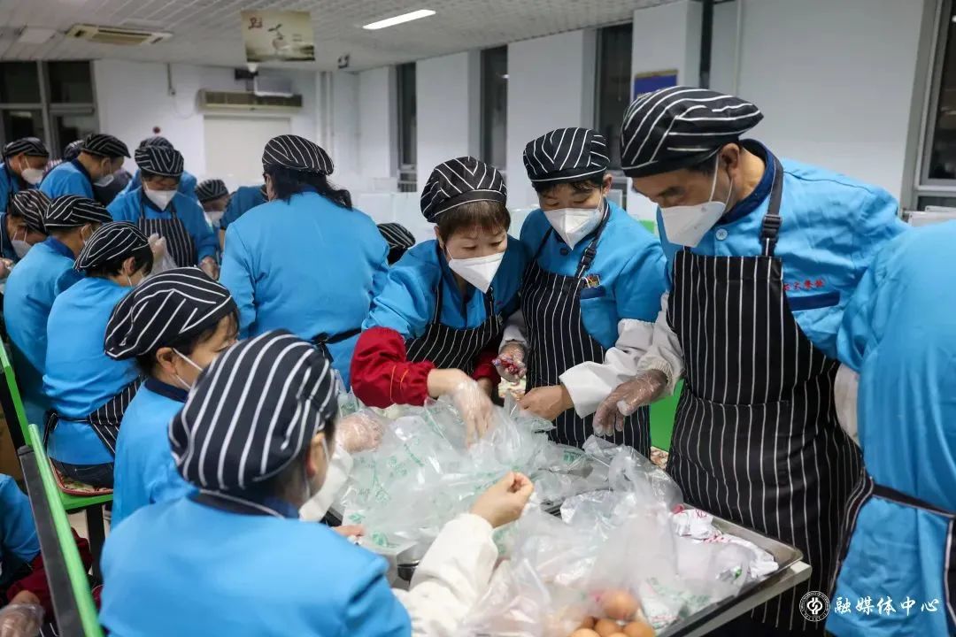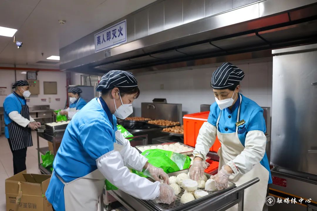 跟劉海濤一樣的餐飲人員還有很多。面對巨大的供餐壓力,餐飲師傅們常常通宵備餐。凌晨2點,就已起床接收原材料;凌晨3點,開始準備早餐包子的加工。天還未亮,就全員集結,開始打包早餐。燈火通明的食堂里,處處是餐飲人忙碌的身影。