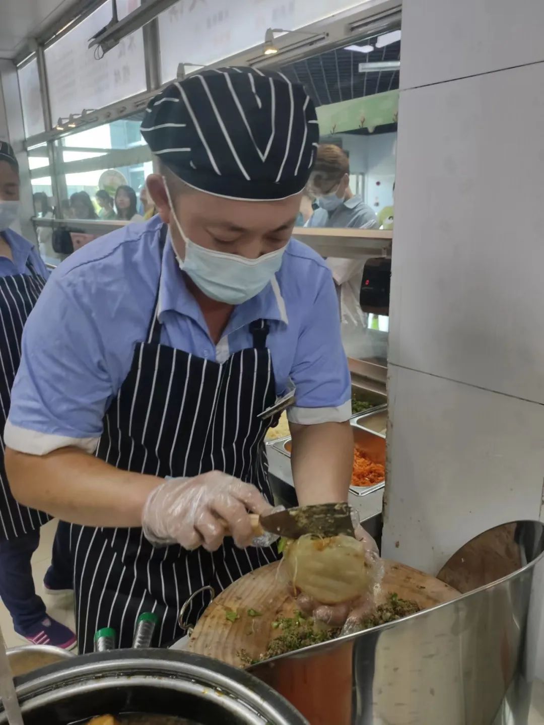 切完肉還要幫著打飯、裝飯,“學生們也都不容易,每盒飯都裝得滿滿的,一定得讓孩子們都吃飽。”