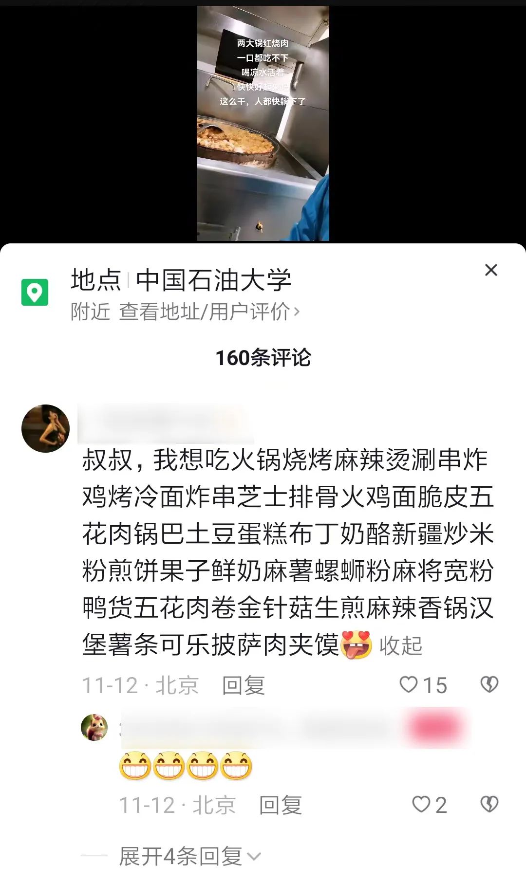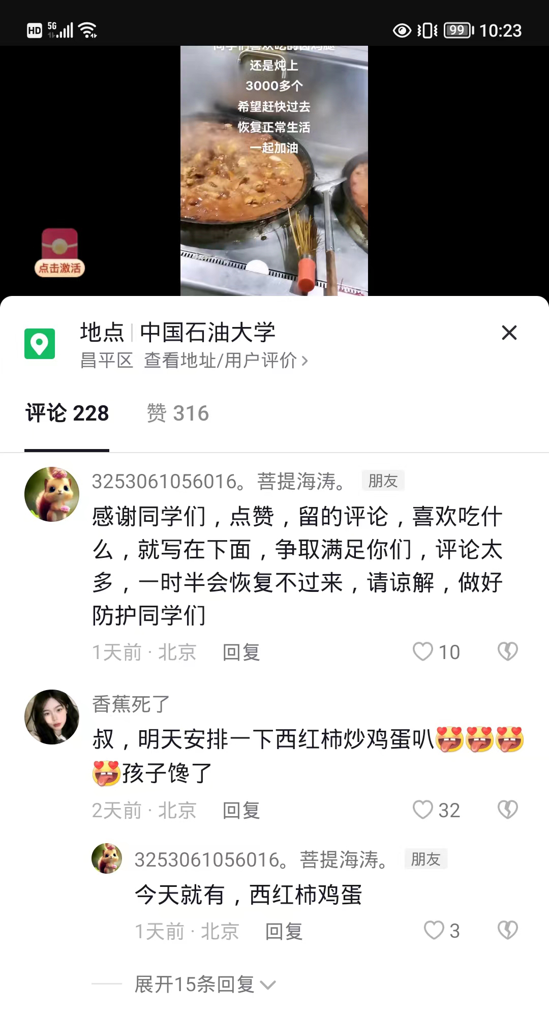 2018年,劉海濤來到中石大從事餐飲工作。自學校進入臨時管控狀態以來,同學們雖然分隔在各個宿舍區域,卻不知從哪兒知道了“風聲”,陸續不約而同地“聚到”劉海濤的短視頻下留言互動,或“下單”點菜,或道聲問候,或點贊致謝,或提建議想法……劉海濤也總是盡量滿足學生們的需求。