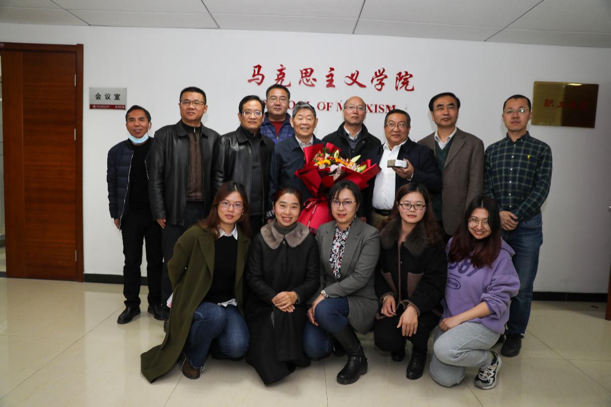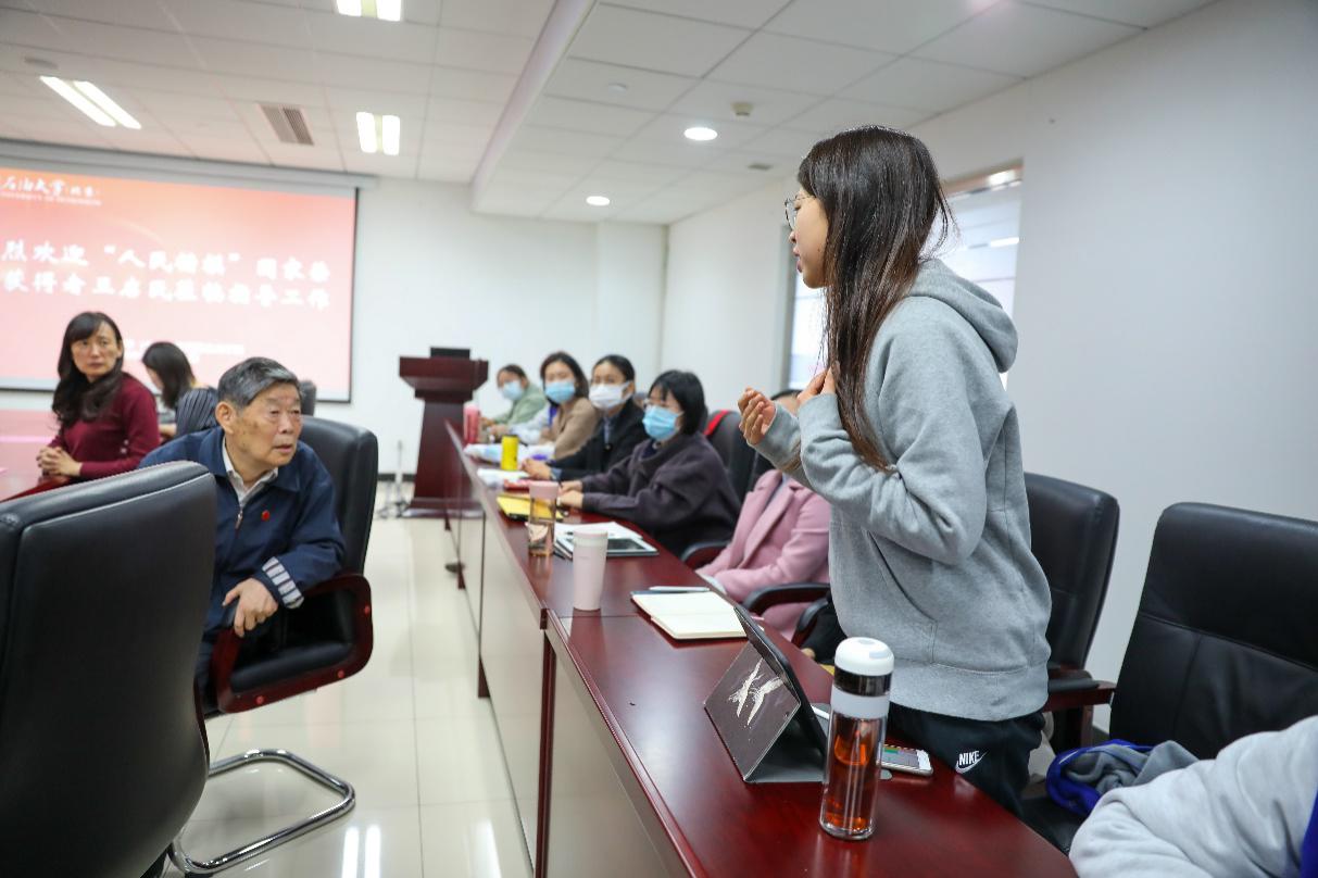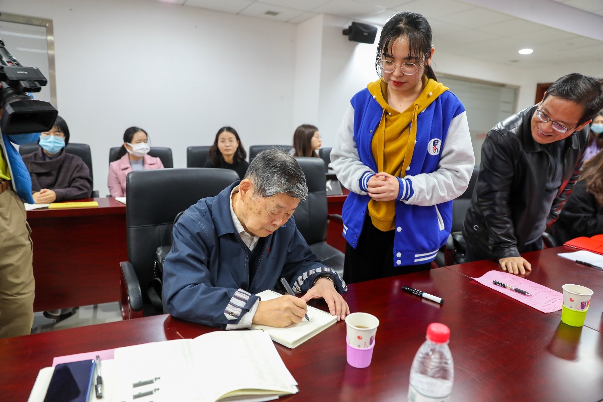 啟民校友本次的中石大行,因為年事已高和身體原因,得以成行已經相當不容易。但出乎所有人意料的是,老人家到了校園里,不顧旅途疲乏,48小時內行程滿滿。第一站,他就參觀了“學習回信精神,勇擔時代使命”主題展覽。在參觀過程中,他被路過的馬克思主義學院曹培強教授認了出來。曹教授熱情地與啟民校友交流,他驚喜地發現,眼前這位老人不僅是一位科研狂人,在政治理論方面還有極高的素養,對很多問題有著相當深刻且獨到的見解。他感慨道:自己作為思政課老師,常常給同學們講鐵人精神,但直到今天才終于有機會見到“新時期鐵人”并當面交流和學習,實在是太激動了。這次偶遇,讓曹教授深感幸運,他征得啟民校友的同意后,將他們的談話錄音并與啟民校友合影,為以后的思政課保留下珍貴的影像資料。但同時,因為啟民校友在中石大的行程安排很緊湊,馬克思主義學院的其他老師可能就無緣與啟民校友當面交流,曹教授為此倍感遺憾。啟民校友得知后,不辭辛苦,特意將臨動身去機場前的一個小時時間擠出來,與馬克思主義學院的青年師生進行交流座談,回答了馬克思主義學院師生的提問,為馬克思主義學院題詞,為學生簽名,并與大家合影留念。啟民校友在校的第一站和最后一站都和馬克思主義學院有關,所有互動問答都是在馬克思主義學院,不能不說是啟民校友和馬克思主義學院的特殊緣分,這也讓馬克思主義學院的老師同學們驚喜和獲益匪淺!