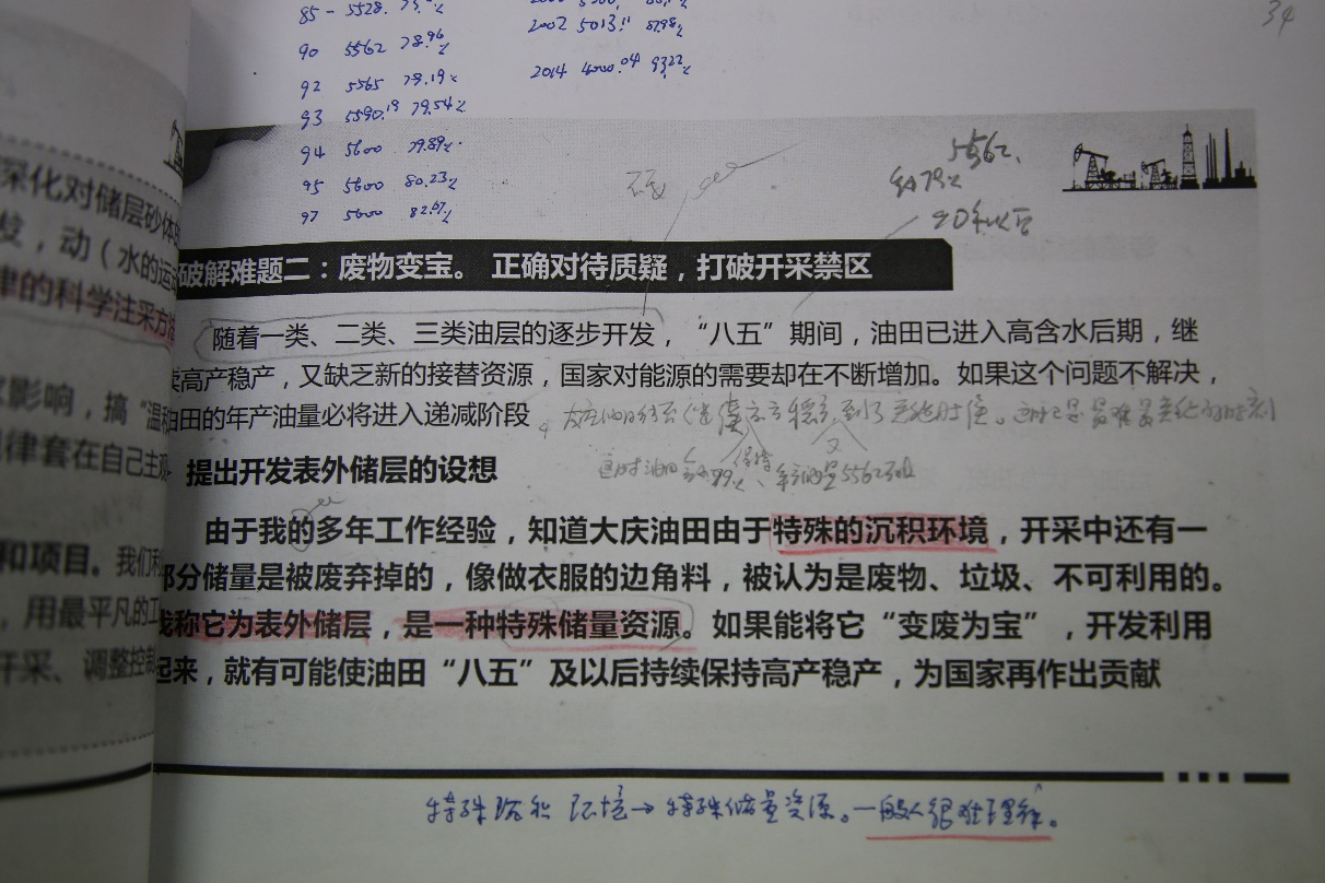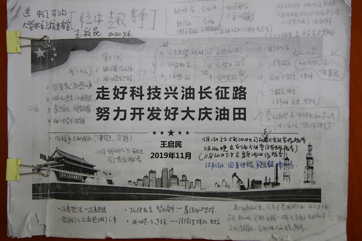 此次展覽獲得了一份與眾不同的手稿。手稿很新又很舊。很新是因為上面寫著時間2019年11月,很舊是因為已經磨損嚴重。在封面上的左上角,有一句啟民校友手寫的 “送中國石油大學(北京)校史館”,并附有啟民校友簽名。翻開這本PPT講稿,讓人大吃一驚,幾乎所有空白處,都有密密麻麻的手寫批注,隨機選取幾個,都是金玉良言:“能吃小苦小難,造就普通平凡人;能吃大苦大難,造就突出人才;能吃特殊苦難,造就杰出人才。”“特殊沉積環境,特殊儲量資源,一般人很難理解。”“癡——是對事業的愛。”這是啟民校友在獲得國家榮譽稱號后,受邀給不同單位講課時所用的PPT講稿,他每次講課前都會再次精心準備,加上自己新的思考和感悟,反復翻閱,手稿就變得很舊。這不同顏色,不同筆跡的一筆一劃間,浸透了老人家幾十年來的思想結晶和對后輩的殷切希望。手稿是老人家八十多年人生的高度概括和總結。這份手稿也是學校準備此次展覽的最早“藍本”,啟民校友將其簽名捐獻給校史館,成為本次展覽背后的重要收獲。
