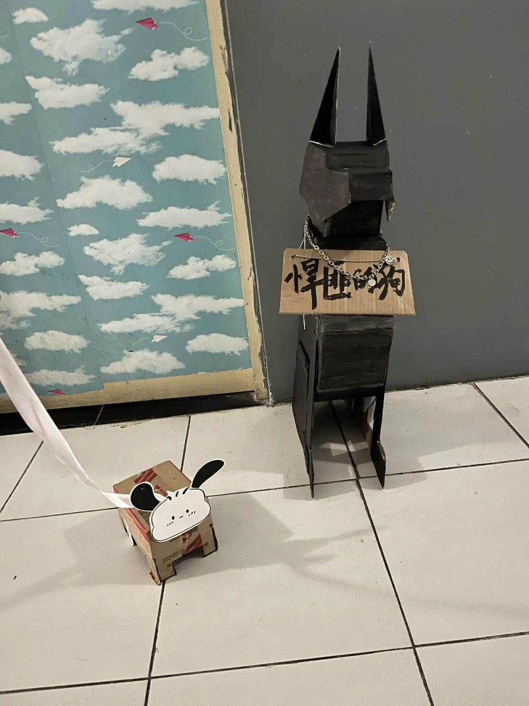 最近學生宿舍還流行養“狗”了,用紙盒自制的悍狗或萌犬,各種可愛扮相的狗狗們,紛紛在宿舍門口高調亮相,一副“兄弟們,我來幫你趕走病毒吧!”的架勢。