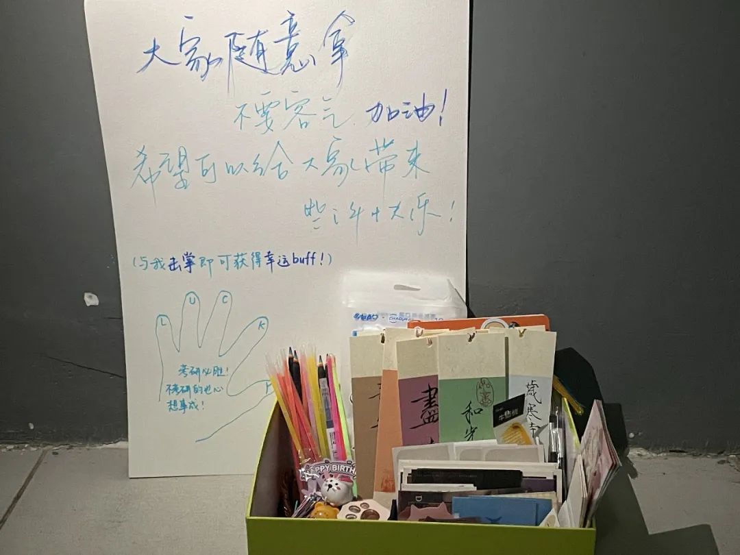 這兩天潤杰公寓2號樓二樓的樓口,同學們被一個方形的盒子吸引。“大家隨意拿,不要客氣,加油!”“希望可以給大家帶來些許快樂!”盒子旁邊用彩筆寫著這樣的提示語,盒子里擺滿了漂亮的手繪明信片。