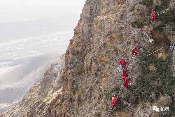 2019年10月26日,新疆塔里木盆地,天山南麓,物探工人要通過繩索才能爬到山腰作業。